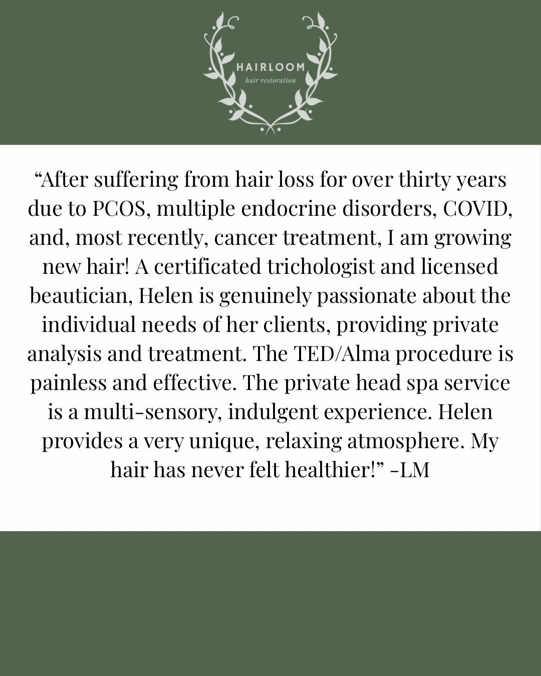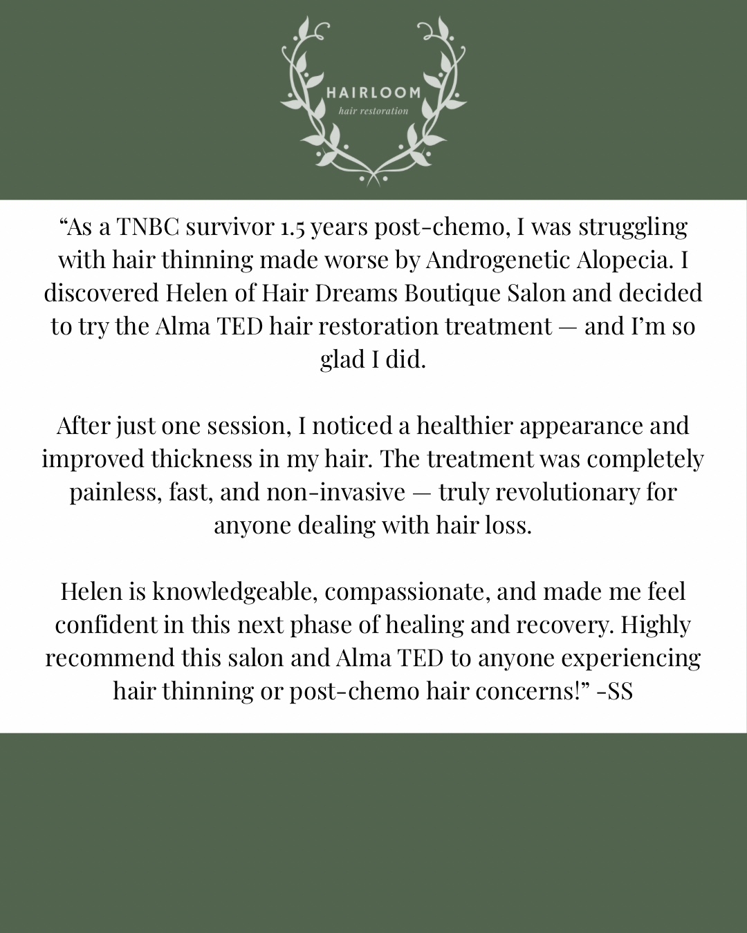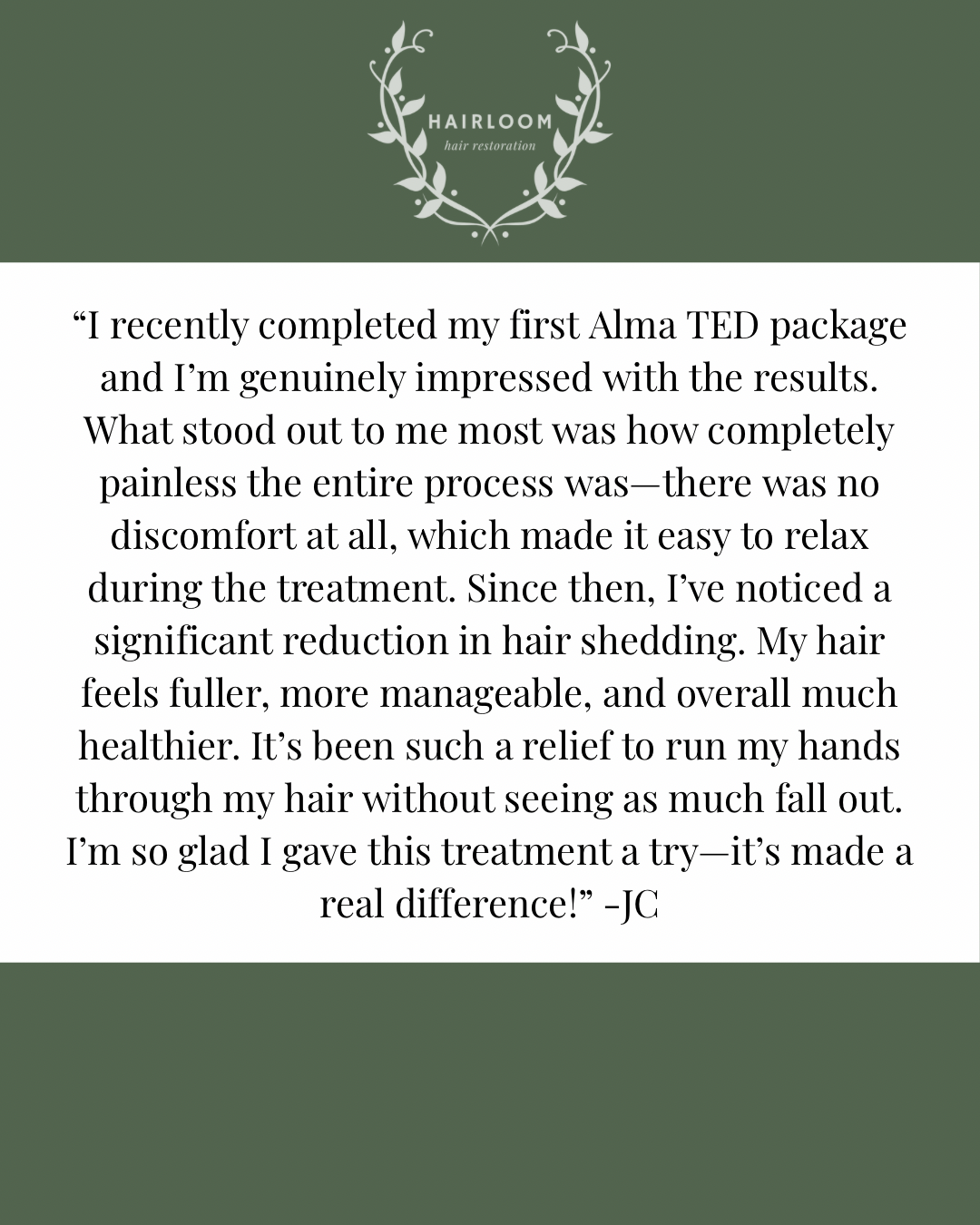 A. Anyone experiencing mild to moderate hair thinning or shedding (like early-stage androgenetic alopecia or stress-related hair loss) would benefit. It works best on individuals who still have functioning hair follicles. TED has been shown to treat hair loss conditions such as Androgenic Alopecia, Alopecia Areata, Traction Alopecia, Hair Loss from Chemo, Hair Loss from COVID, Hair Loss from GLP1s, Postpartum Shed, Telogen Effluvium, Trichotillomania, etc.